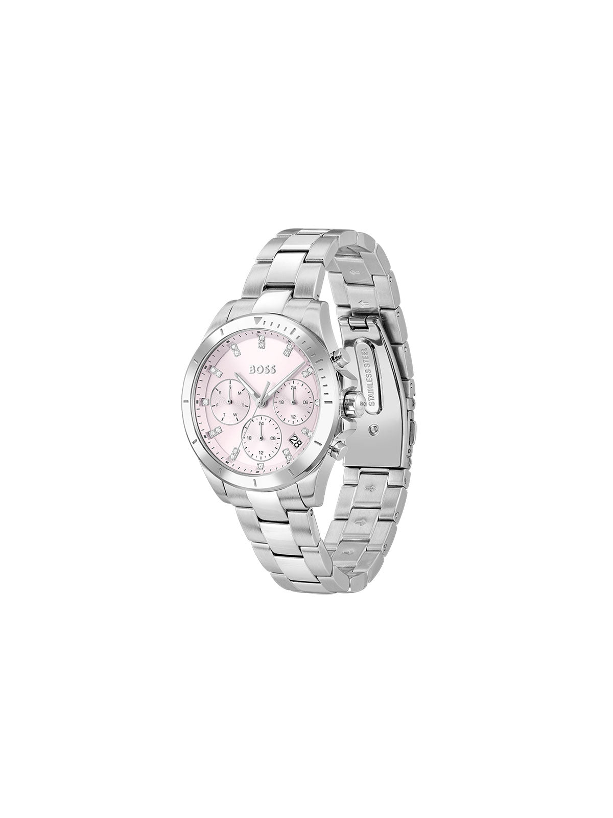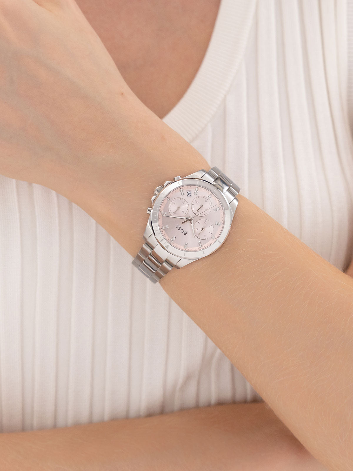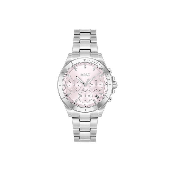 Ženstvena sportska sofisticiranost je prava odlika ovoj ženskog BOSS Watches sata. Multifunction mehanizam, svetlo roze brojčanik i narukvica od nerđajućeg čelika u boji srebra.
