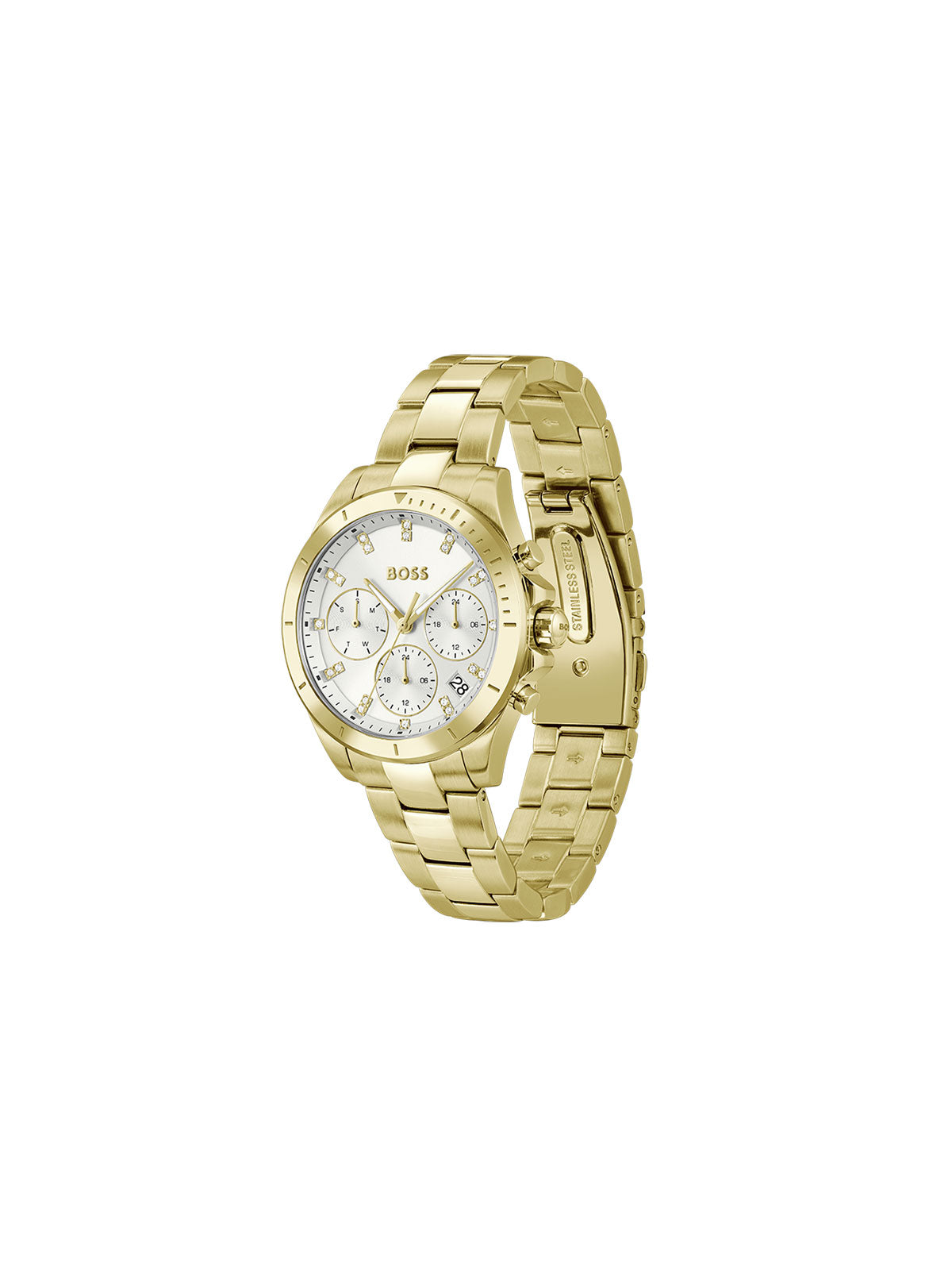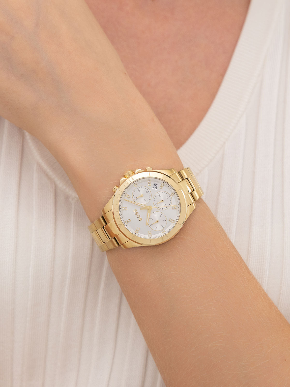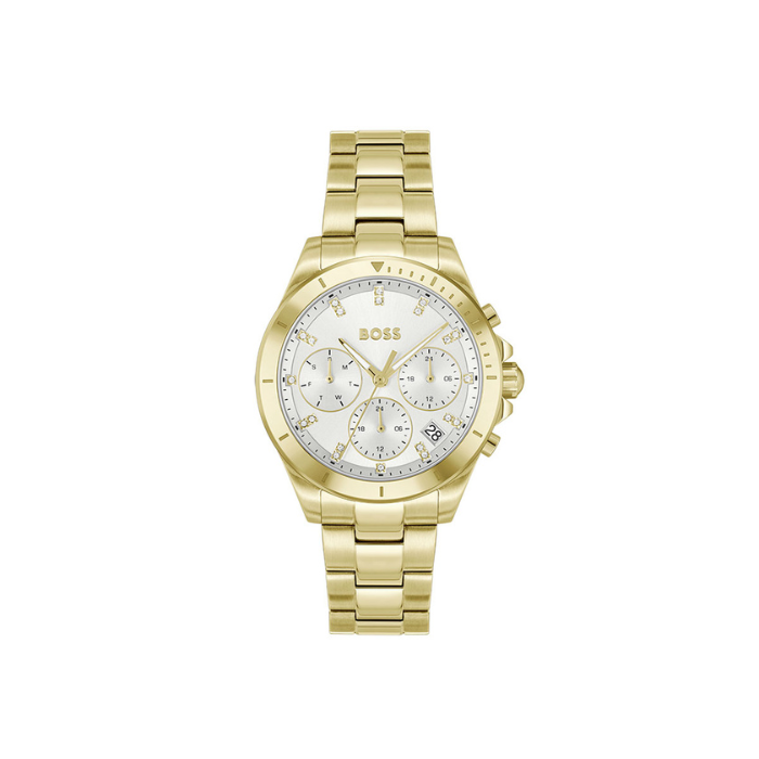 Ženstvena sportska sofisticiranost je prava odlika ovoj ženskog BOSS Watches sata. Multifunction mehanizam, srebrno beli brojčanik i narukvica od nerđajućeg čelika u boji žutog zlata.