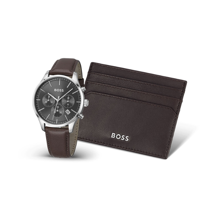 AVERY BOX SET 1570188: BOSS Watches MUŠKI SAT HRONOGRAF SA BRAON KOŽNOM NARUKVICOM I KOŽNA FUTROLA ZA KARTICE
