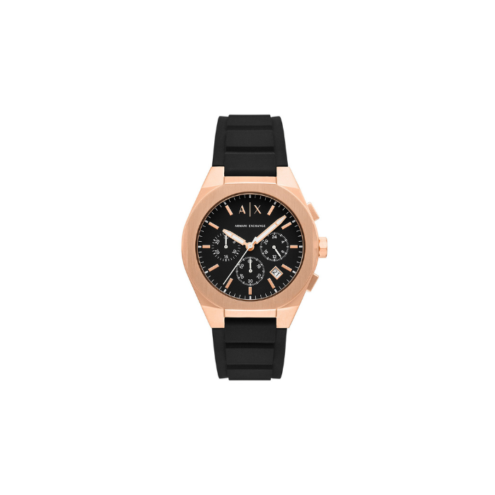 Armani Exchange kvarcni sat sa 42mm roze zlato kućištem od nerđajućeg čelika, crnim brojčanikom sa roze zlatnim indeksima i prikazom datuma, mineralnim staklom i crnom silikonskom narukvicom. Vodootpornost sata je 5 ATM.