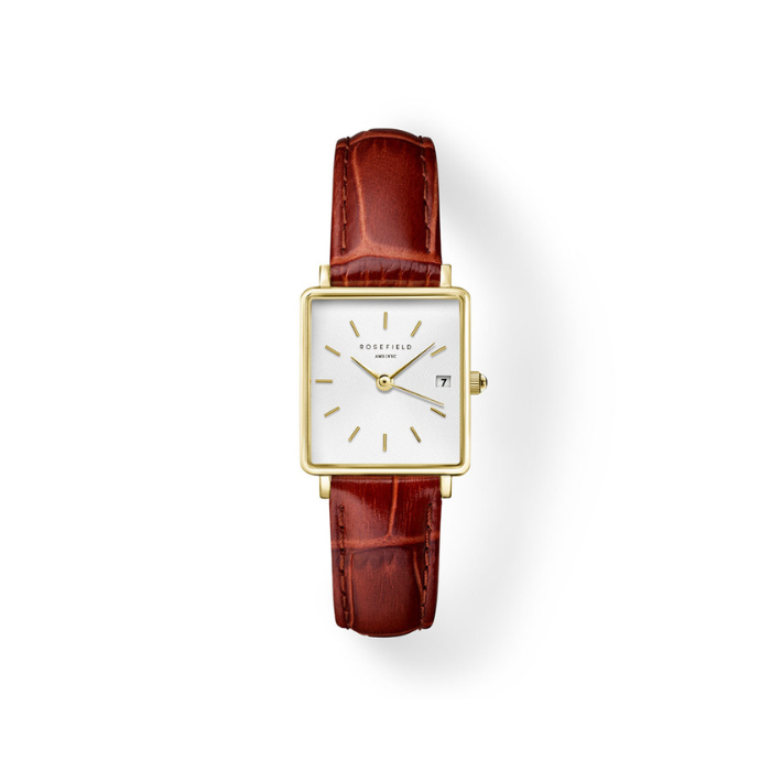 ROSEFIELD BOXY XS BROWN LEATHER: KVADRATNI ROSEFIELD ŽENSKI SAT KUĆIŠTE BOJE ZLATA I BRAON KOŽNA NARUKVICA