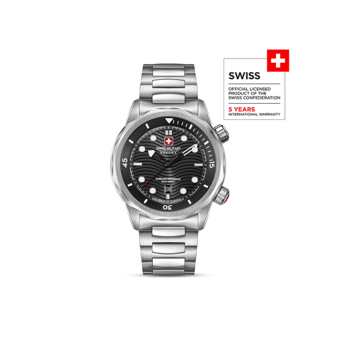 SWISS MILITARY HANOWA BREAKWATER SMWGH0006404: SWISS MADE KVARCNI MUŠKI SAT, 300m VODOOTPORNOST, CRNI BROJČANIK