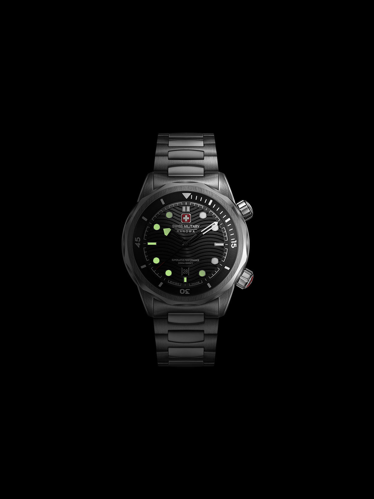 BREAKWATER: Napravljen da osvoji dubine. Sa robusnim kućištem od 43 mm i gradijentno crnim brojčanikom sa talasastim uzorkom, ovaj sat je podjednako smeo koliko i funkcionalan. Dve krunice koje se zavrću – jedna za podešavanje vremena, a druga za podešavanje vremena ronjenja, pružaju vam preciznu kontrolu. Nudeći impresivnih 30 ATM vodootpornosti, sat je dizajniran za avanturu.