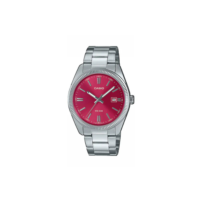 Klasični CASIO analogni sat sa prikazom datuma, brojčanikom crvene boje i mineralnim staklom. Osvetljene kazaljke olakšavaju čitanje vremena u mraku, a takođe je vodootporan do 50m.