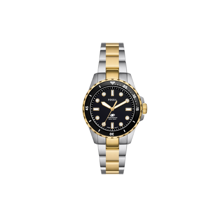 Fossil Blue Dive ženski kvarcni sat ima 36mm srebrno kućište, crni brojčanik, mineralno staklo i bikolornu narukvicu od nerđajućeg čelika.