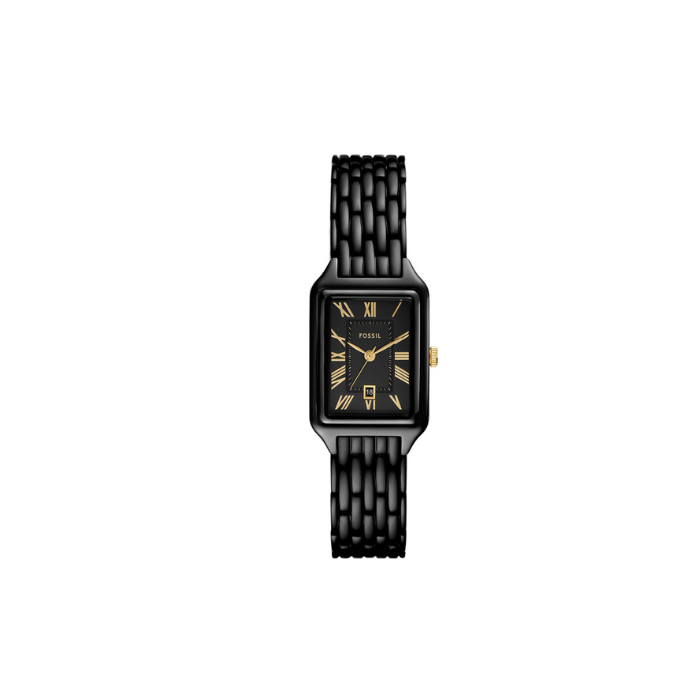 Fossil Raquel ženski kvarcni sat ima 23mm crno pravougaono kućište od nerđajućeg čelika, crni brojčanik sa zlatnim indeksima i prikazom datuma, mineralno staklo i crnu narukvicu od nerđajućeg čelika.