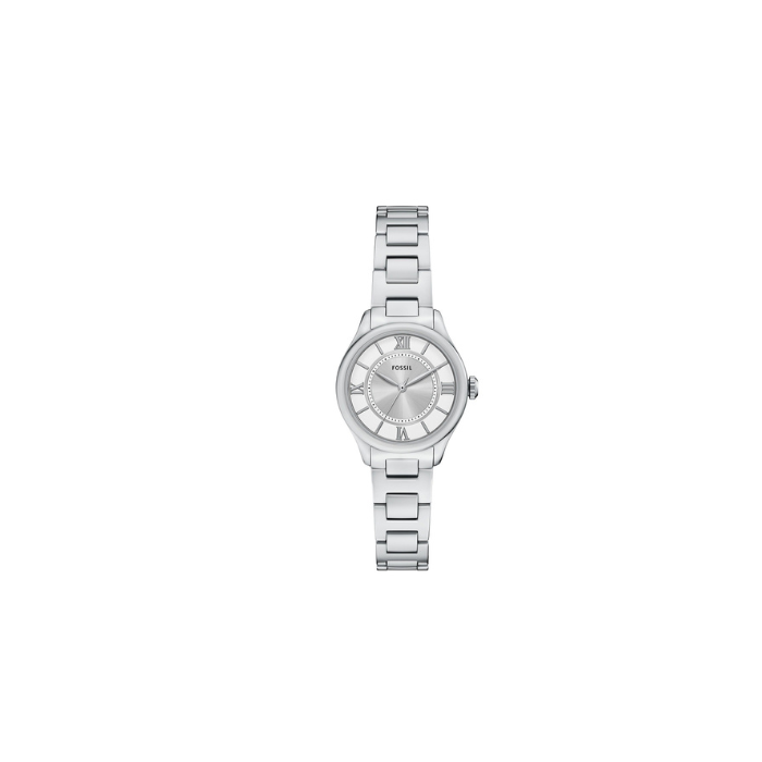 Fossil Gilmore ženski kvarcni sat ima 28mm srebrno kućište, srebrni brojčanik, mineralno staklo i srebrnu narukvicu od nerđajućeg čelika.