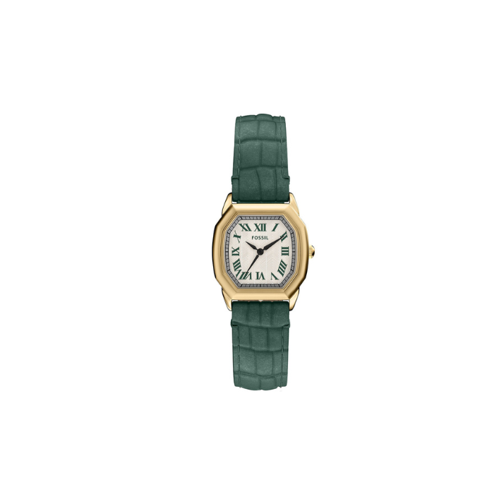 Materijal kućišta: nerđajući čelik Pol: ženski Brendovi: Fossil Boja brojčanika: bež Boja kućišta: zlatna Boja narukvice: zelena Materijal narukvice: koža Oblik kućišta: osmougaono Tip sata: analogni Veličina kućišta (mm): 27 Vodootpornost: 3 ATM Vrsta mehanizma: kvarcni Vrsta stakla: mineralno