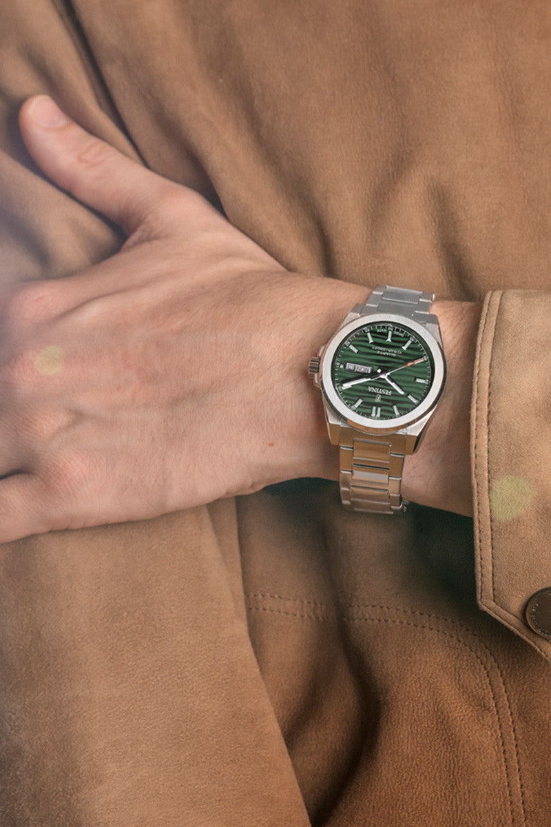 Sa zelenim brojčanikom sa prikazom dana i datuma, narukvicom od nerđajućeg čelika i safirnim staklom. Vodootpornost sata je 10 ATM.