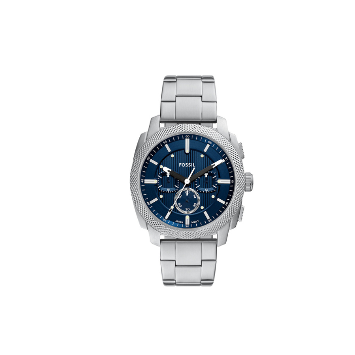 Fossil Machine muški hronograf ima 44mm srebrno kućište, teget brojčanik, mineralno staklo i srebrnu narukvicu od nerđajućeg čelika.