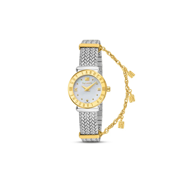 Materijal kućišta: nerđajući čelik Pol: ženski Brendovi: Guy Laroche Boja brojčanika: bela Boja kućišta: srebrna i zlatna Boja narukvice: srebrna Materijal narukvice: nerđajući čelik (mesh) Veličina kućišta (mm): 25 Debljina kućišta (mm): 8 Tip sata: analogni Vrsta mehanizma: kvarcni (baterija) Vodootpornost: 5 ATM Vrsta stakla: safirno