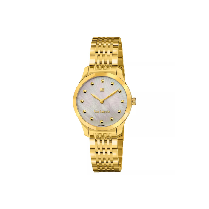 Materijal kućišta: nerđajući čelik Pol: ženski Brendovi: Guy Laroche Boja brojčanika: sedef Boja kućišta: zlatna Boja narukvice: zlatna Materijal narukvice: nerđajući čelik Veličina kućišta (mm): 29 Debljina kućišta (mm): 9 Tip sata: analogni Vrsta mehanizma: kvarcni (baterija) Vodootpornost: 5 ATM Vrsta stakla: safirno