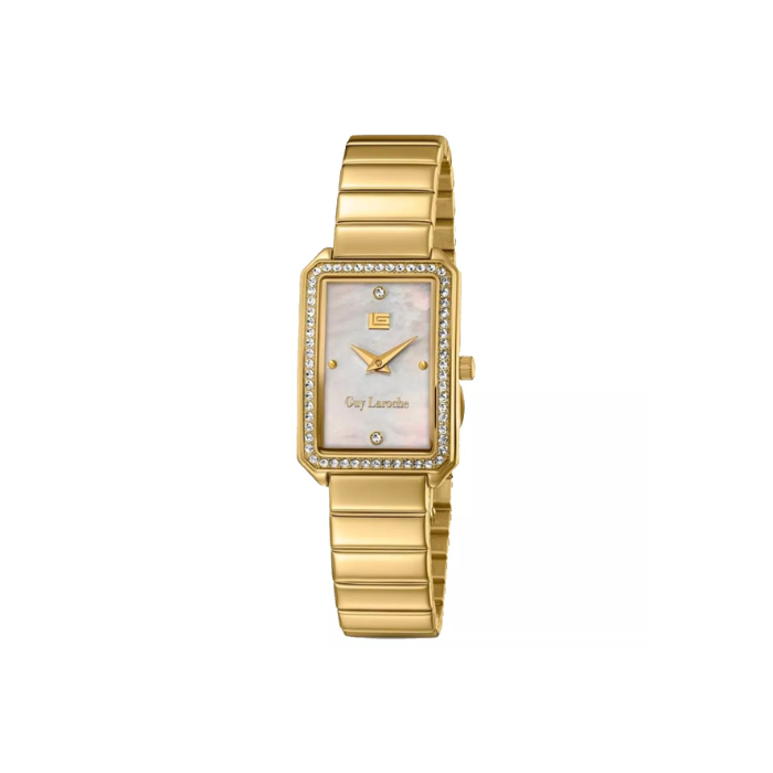 Brend: Guy Laroche Pol: Ženski Vrsta proizvoda: Ručni sat Mehanizam: Kvarcni Materijal kućišta: Nerđajući čelik Boja kućišta: Zlatna Prečnik kućišta: 23 mm Boja brojčanika: Srebrna Materijal narukvice: Nerđajući čelik Boja narukvice: Zlatna Staklo: Safirno Vodootpornost: 5 ATM