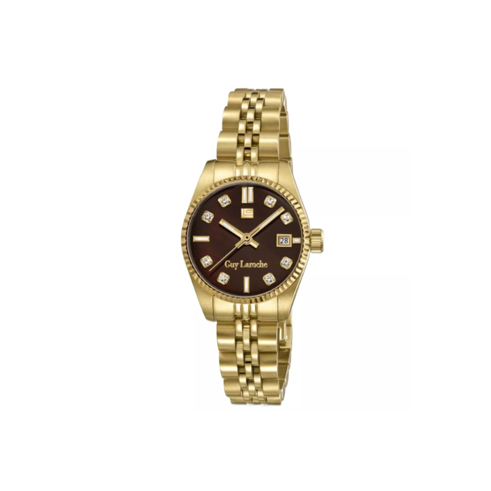 Brend: Guy Laroche Pol: Ženski Vrsta proizvoda: Ručni sat Mehanizam: Kvarcni Materijal kućišta: Nerđajući čelik Boja kućišta: Zlatna Prečnik kućišta: 26 mm Boja brojčanika: Braon Materijal narukvice: Nerđajući čelik Boja narukvice: Zlatna Staklo: Safirno Vodootpornost: 5 ATM