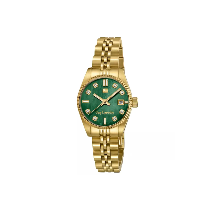 Brend: Guy Laroche Pol: Ženski Vrsta proizvoda: Ručni sat Mehanizam: Kvarcni Materijal kućišta: Nerđajući čelik Boja kućišta: Zlatna Prečnik kućišta: 26 mm Boja brojčanika: Zelena Materijal narukvice: Nerđajući čelik Boja narukvice: Zlatna Staklo: Safirno Vodootpornost: 5 ATM