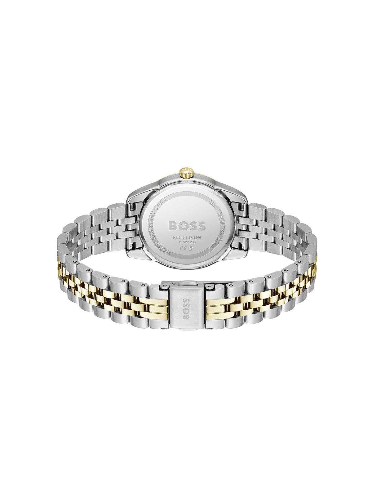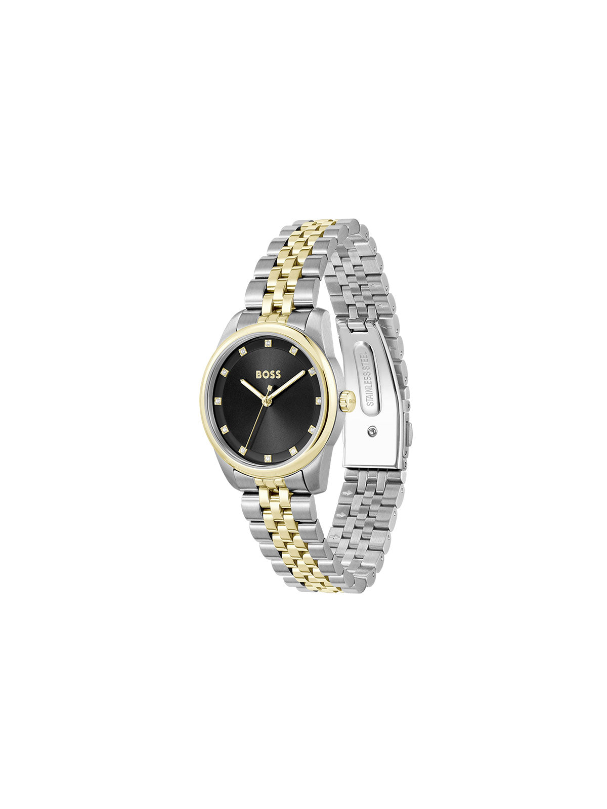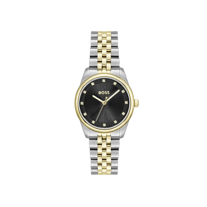 Ovaj ženski BOSS Watches je pravi elegantan model. Kućište i narukvica od nerđajućeg čelika u dve boje srebro/žutoi zlato, brojčanik crne boje sa cirkonima na markerima za sate.