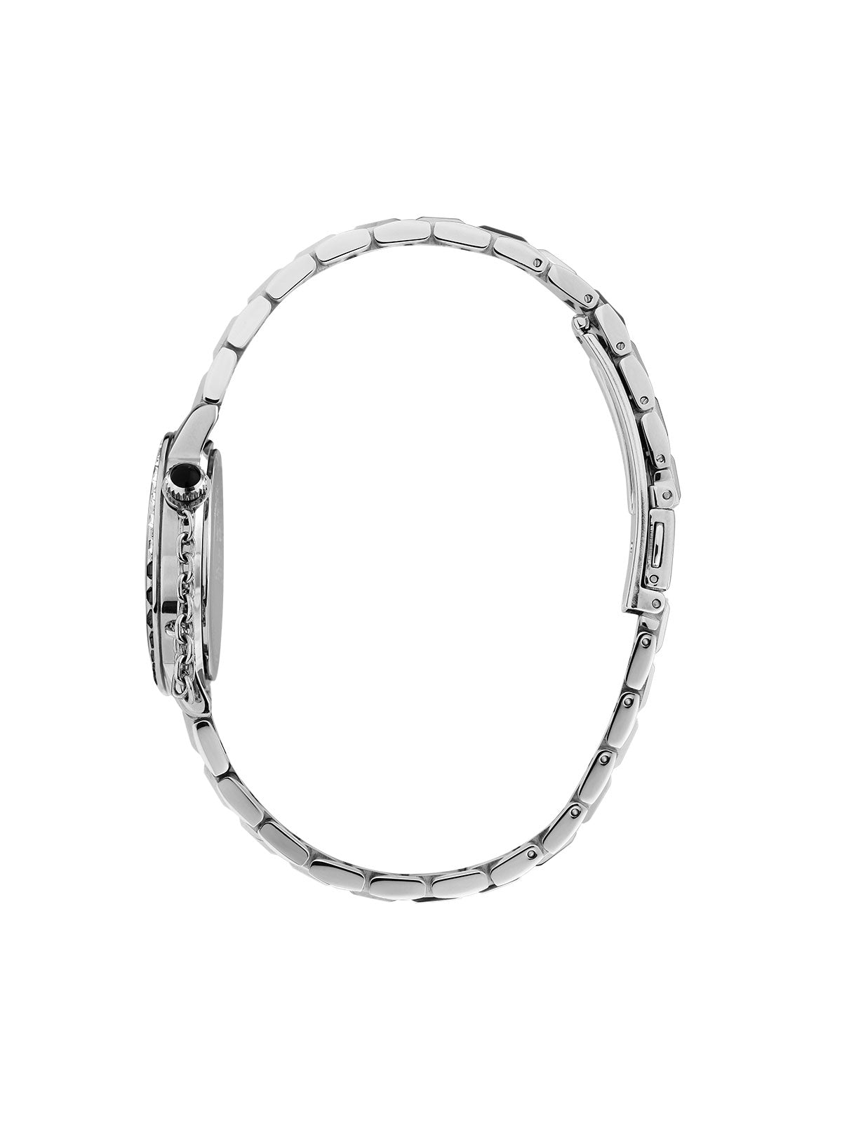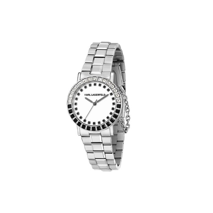Impresivan sat sa prefinjenim detaljima, ima narukvicu od nerđajućeg čelika srebrne boje i crno-beli okvir kućišta ukrašen kristalima, naglašen logotipom KARL LAGERFELDA na okruglom brojčaniku. Dizajn spaja oštar stil sa bezvremenskom privlačnošću. Elegantan sat sa rok-šik detaljima.