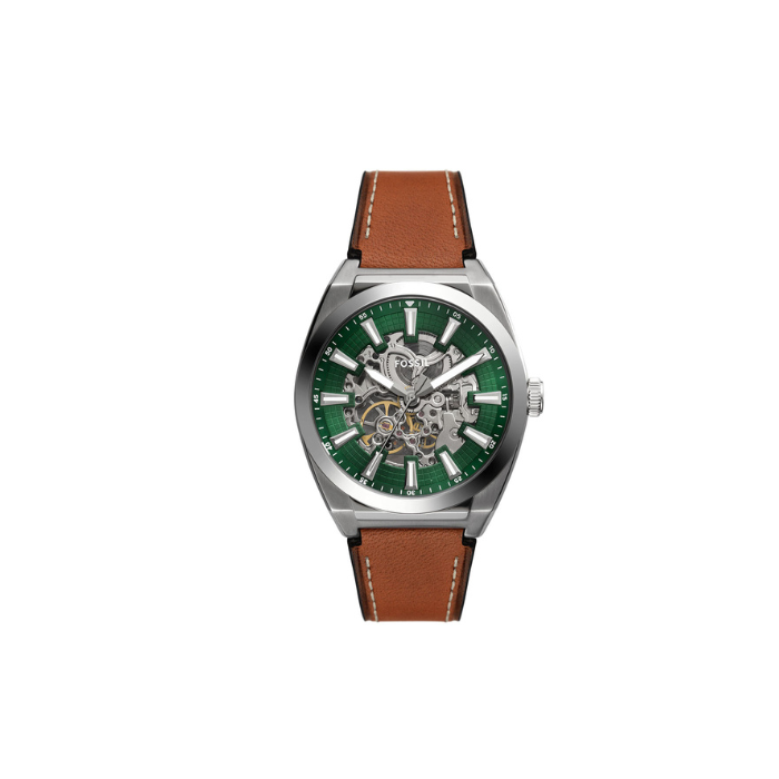 Fossil Everett muški automatik ima 42mm srebrno kućište od nerđajućeg čelika, zeleni brojčanik, safirno staklo otporno na grebanje i braon kožnu narukvicu.
