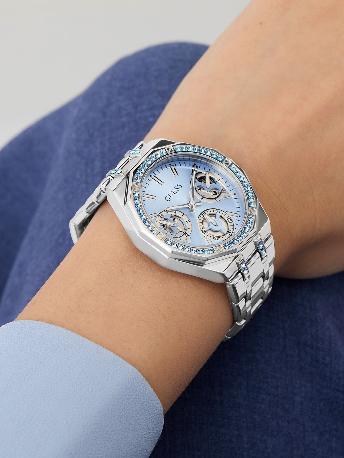 GUESS ŽENSKI SAT "QUINN" GW1009L1 MULTIFUNCTION U BOJI SREBRA SA SWAROVSKI SVETLO PLAVIM CIRKONIMA