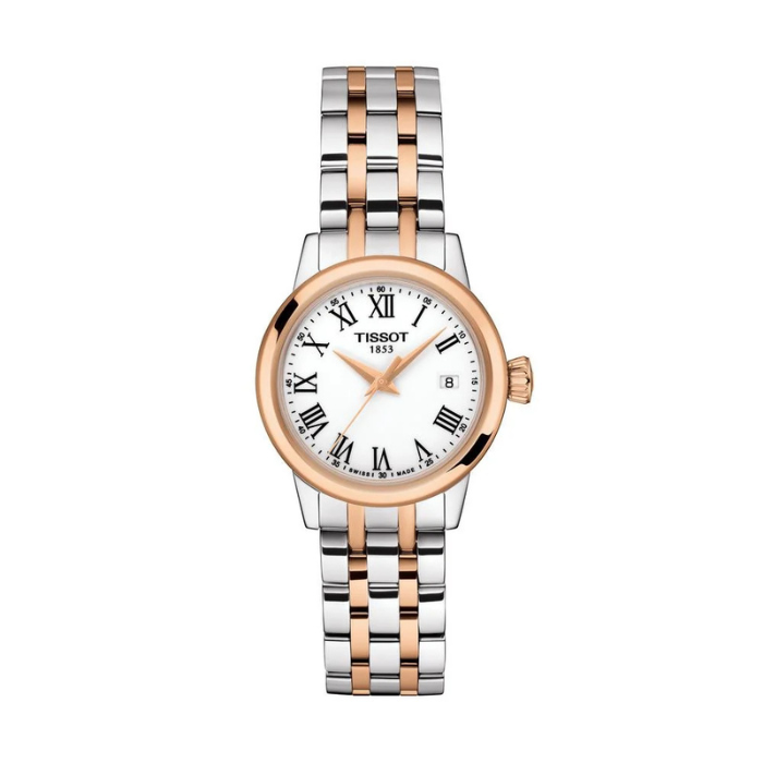 Materijal: Nerđajući čelik Staklo: Safirno, otporno na ogrebotine Brojčanik: Beli Brojevi: Rimski Dimenzije kućišta: 28 mm Poklopac kućišta: Tip mehanizma: Kvarcni Oznaka mehanizma: ETA F04.115 Kalibar: 8 3/4''' Vodootpornost: 5 bara (50 m / 165 ft) Tip narukvice: Tip kopče: Leptir kopča sa tasterima Pol: Ženski Rezerva snage: Prikaz: Sat, minut, sekund, datum (HMSD) Funkcije: EOL (indikator kraja trajanja baterije)
