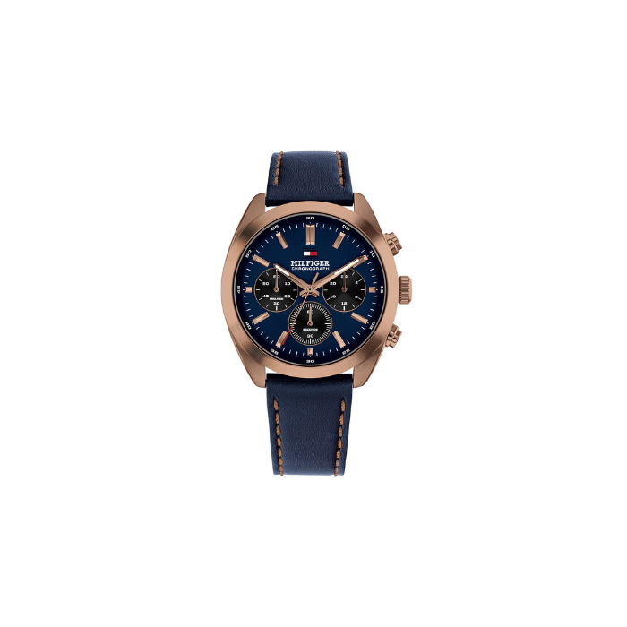 Materijal kućišta: nerđajući čelik Pol: muški Brendovi: Tommy Hilfiger Funkcije: štoperica Boja brojčanika: plava Boja kućišta: roze zlato Boja narukvice: plava Materijal narukvice: koža Oblik kućišta: okruglo Proizvodjac: SWISSAM PRODUCT LIMITED Veličina kućišta (mm): 40 Vodootpornost: 5 ATM Vrsta stakla: mineralno
