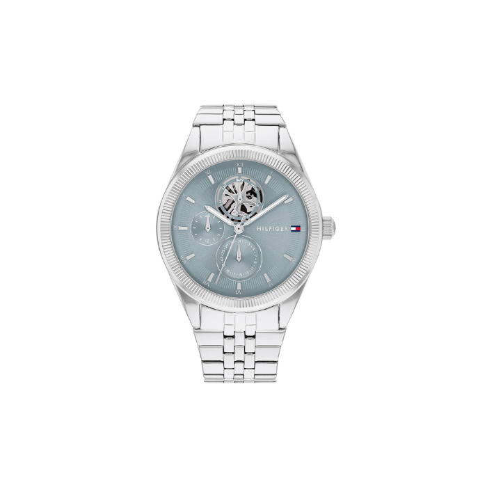 Tommy Hilfiger ženski kvarcni sat ima 38mm srebrno kućište vodootporno 3 ATM, svetlo plavi brojčanik sa prikazom doba dana, datuma i dana u nedelji, mineralno staklo i srebrnu narukvicu od nerđajućeg čelika.