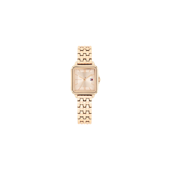 Tommy Hilfiger ženski kvarcni sat ima 24mm roze zlato kvadratno kućište, roze zlato brojčanik i roze zlato narukvicu od nerđajućeg čelika. Vodootpornost sata je 3 ATM.